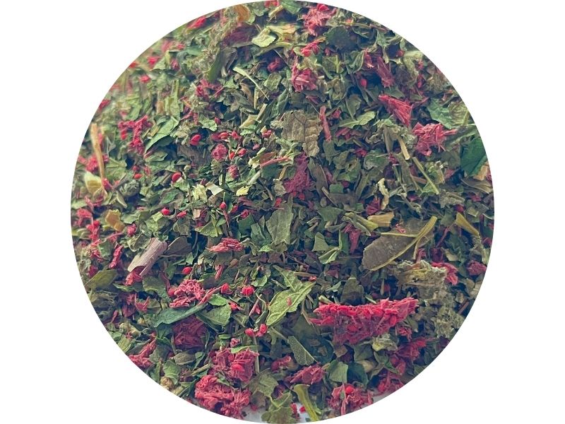 Травяной купаж кусочков яблока, плодов шиповника, листочков брусники и смородины, мяты, лемонграсса, цветов календулы и хризантемы.