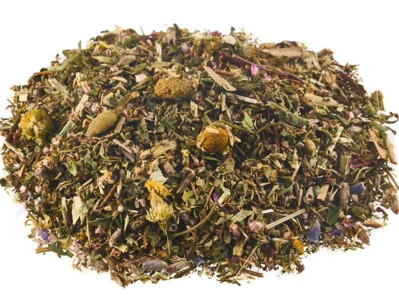 Состав травяного чая: вереск, мята, мелисса, ромашка, душица, лимонная трава, лаванда.